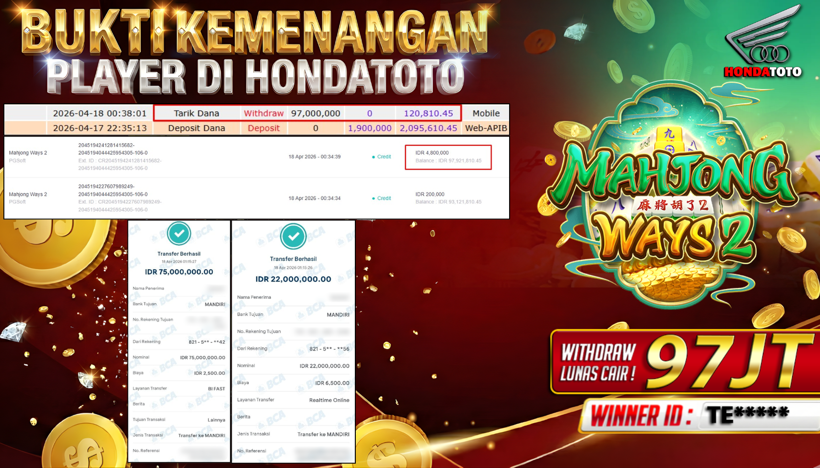 Bandar togel HONDATOTO merupakan bandar togel dan slot online yang membayar semua kemenangan member hingga lunas. Setiap pembayaran pada situs kami dilakukan dengan cara transfer ke rekening tujuan yang sudah di daftarkan pada situs togel online kami, Pembayaran hanya dapat di proses jika rekening yang di daftarkan telah valid dan dapat di transfer. Semua kemenangan member yang mendapatkan hadiah jackpot terbesar akan kami posting agar semua pemain dapat melihat bandar situs terpercaya HONDATOTO ini membayar semua kemenangan member hingga lunas. Setiap postingan yang kami posting akan kami lakukan sensor pada nomor rekening 4 digit dan nama rekening untuk menjaga privasi dan kerahasiaan member. Postingan Jackpot yang kami posting agar member atau pemain yang belum pernah bermain bisa melihat bandar togel Bukan Kaleng Kaleng Seperti HONDATOTO ini, Semua postingan jackpot yang kami posting dapat di lihat data keasliannya melalui nomor reff yang di tunjukan pada bank atau mbanking saat kita melakukan transfer.