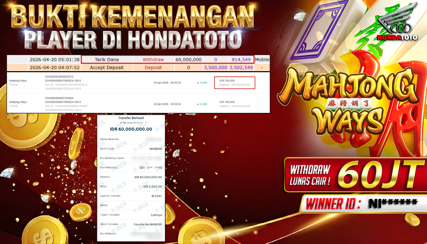 Bukti Kemenangan 20 April 2026 Di PG SOFT MAHJONG WAYS WD 60 Juta